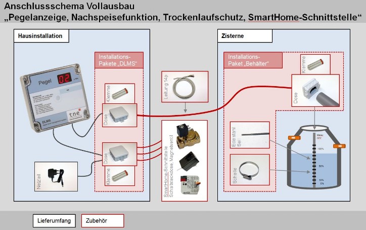 Je nach Filtersystem ist in der Zisterne / Behälter bereits ein vertikales Standrohr D100 für den beruhigten Zulauf des Wassers installiert. Daran können sehr einfach rostfreie Rohrschellen zur Pegeldetektierung angebracht werden (siehe Abbildung).